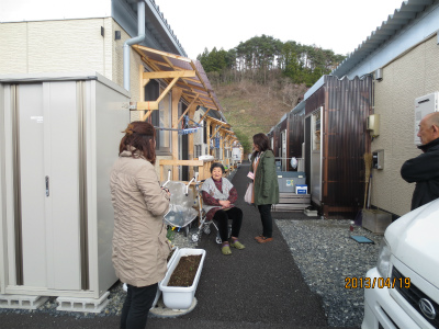 午後は、志津川中学校仮設住宅を訪問しました。午後はさらに気温が下がり、あられが降るほどでした。仮設の駐車場に着いた時、ちょうさんとちょうさんに大工仕事を頼まれた女性に出会いました。一通り自己紹介をした後、少しお話を伺わせていただきました。